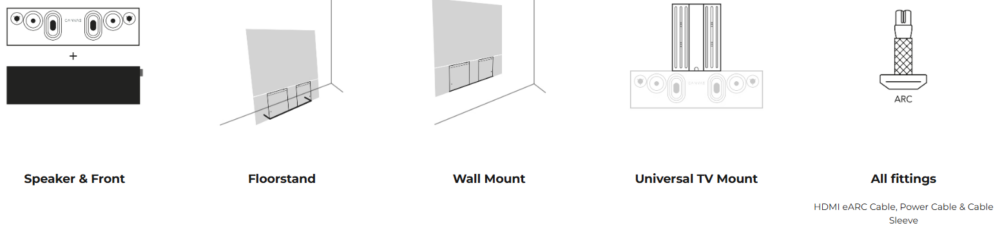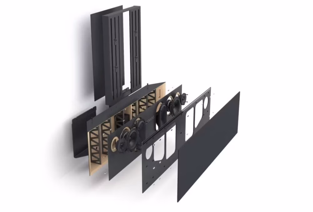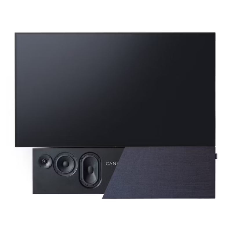 The universal TV Mount allows for mounting and aligning the vast majority of new TV’s on the market, all brands, and in the most popular sizes, 55″, 65″, 75″, 77″, 83″ and 85″. This CANVAS invented solution (patent pending), with matching size front grills, ensures a flush, zero gab alignment of CANVAS speaker and your TV, fusing them together as one seamless unit.